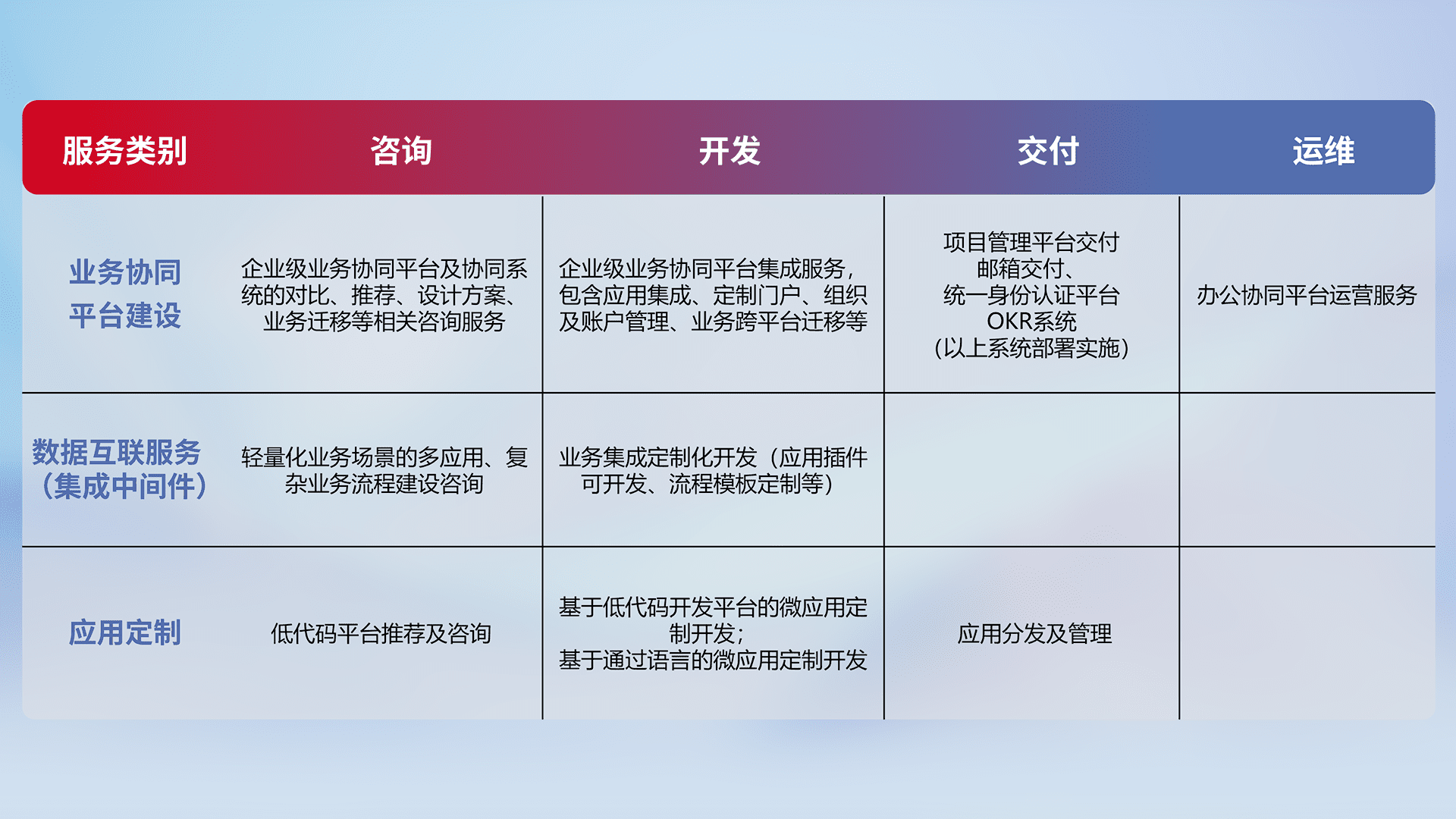 针对钉钉、、、企微、、IDaas等平台级产品提供产品的规划、、、、方案、、、、交付、、、定制化开发等服务,,,实现如统一协同办公、、、智能客户服务、、、混合会议管理、、、、智能数据查询、、、、等业务场景,,实现数字化转型。。。